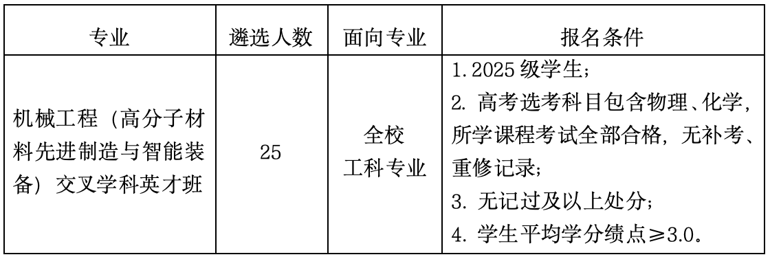 1.交叉学科英才班学生主要是从全校工科专业中进行遴选,遴选优质生源,遴选人数不超过25人。原则上,机械类专业外其他专业遴选录取人数不超过当年该专业招生人数的15%;
