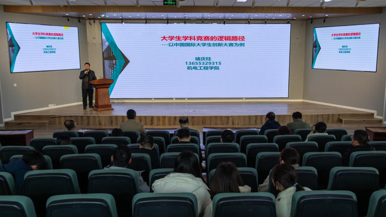 讲座中,褚庆柱以“大学生学科竞赛的逻辑路径”为主题,结合丰富实践经验与典型真实案例进行深入讲解。他从人才培养、学生成长、学科建设三个维度,系统阐释了学科竞赛指导的重要意义,指出其能巩固学生专业知识、激发创新潜能,为学院培育应用型人才、打造科创品牌奠定基础。针对学科竞赛指导实践,褚庆柱运用结构化思维,提出多项务实可行的指导建议:精准锚定竞赛方向,结合学生特长与兴趣科学遴选项目;强化全流程指导,紧密跟进选题立项、方案设计、实践实操等关键环节;注重思维能力培育,着力提升学生创新思维、团队协作与问题解决能力;严守竞赛规则规范,扎实做好赛前筹备与赛后复盘总结,持续积累竞赛指导经验。