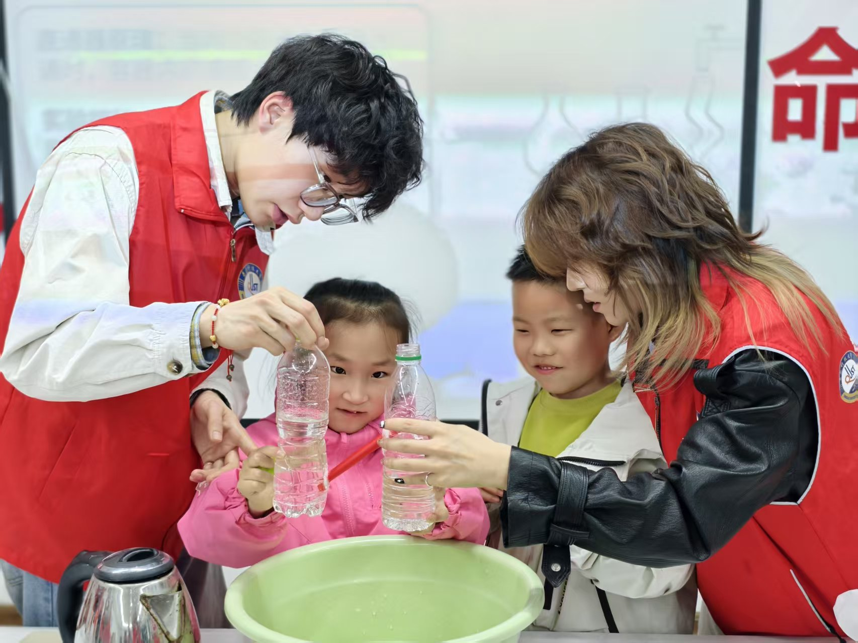 在趣味实操环节,志愿者们带着孩子们分组协作,亲手完成大气压力与浮力的趣味实验,认真记录下每一个新奇的实验现象。沿着“发现-探究-验证”的科学之路,小朋友们不仅牢牢掌握了相关的科学原理,更沉浸式体验了科学探索的完整过程。活动即将结束时,志愿者用趣味提问带领大家回顾知识,孩子们积极互动、大胆分享,整个现场充满了欢乐的学习氛围与满满的探索欲。